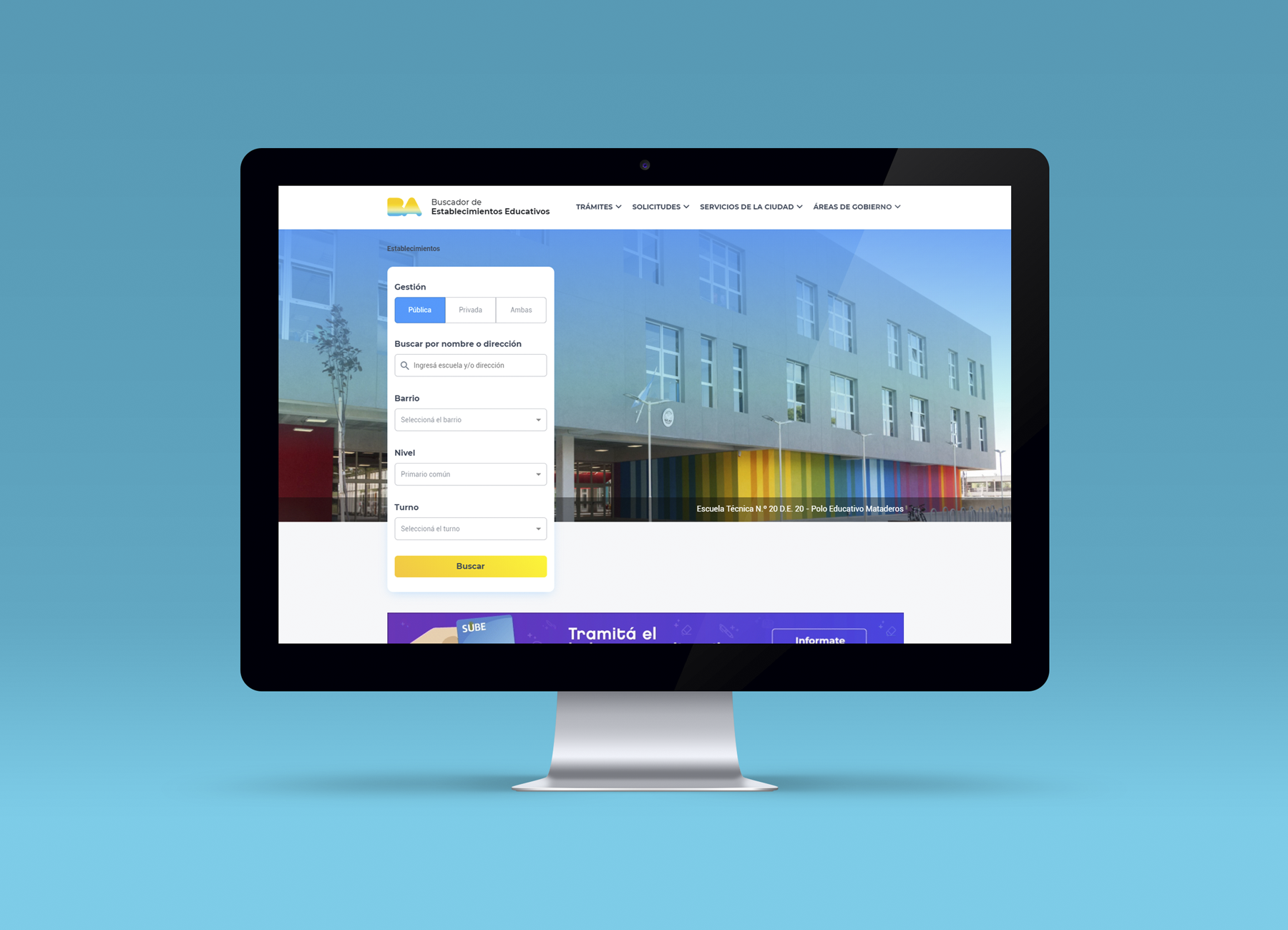 Buscador de establecimientos educativos que permite realizar una búsqueda de escuelas por barrio o cercanía, aplicando filtros y personalizando la búsqueda para encontrar la escuela ideal. Se realizó la maquetación total de componentes para su implementación en desarrollo y la integración en el layout. Posteriormente se armó la estructura de cada página teniendo en cuenta el diseño original.